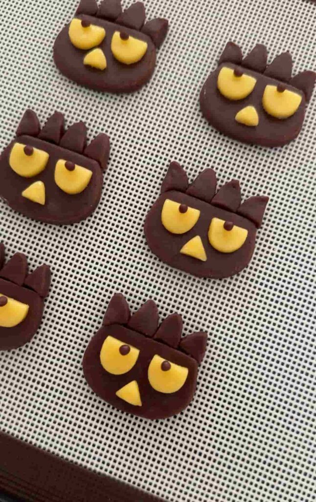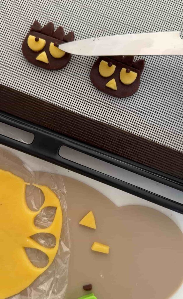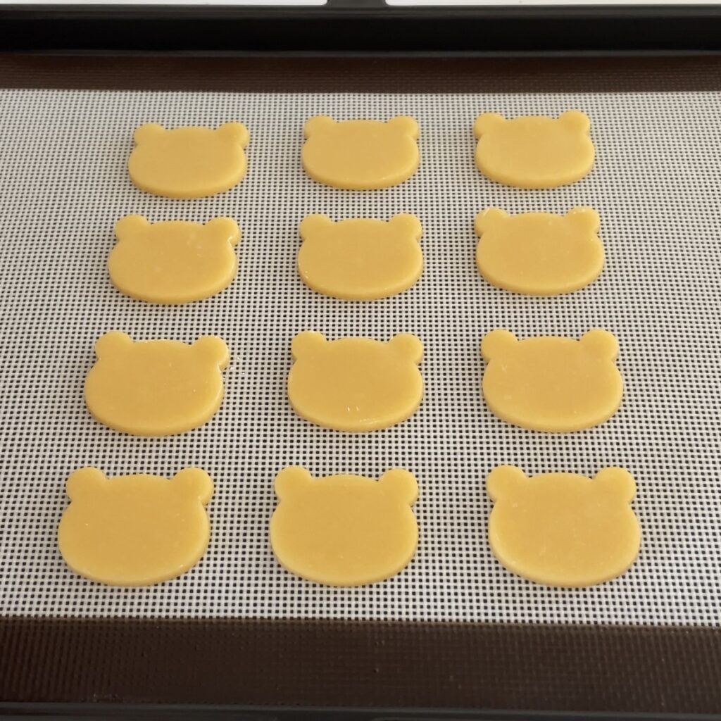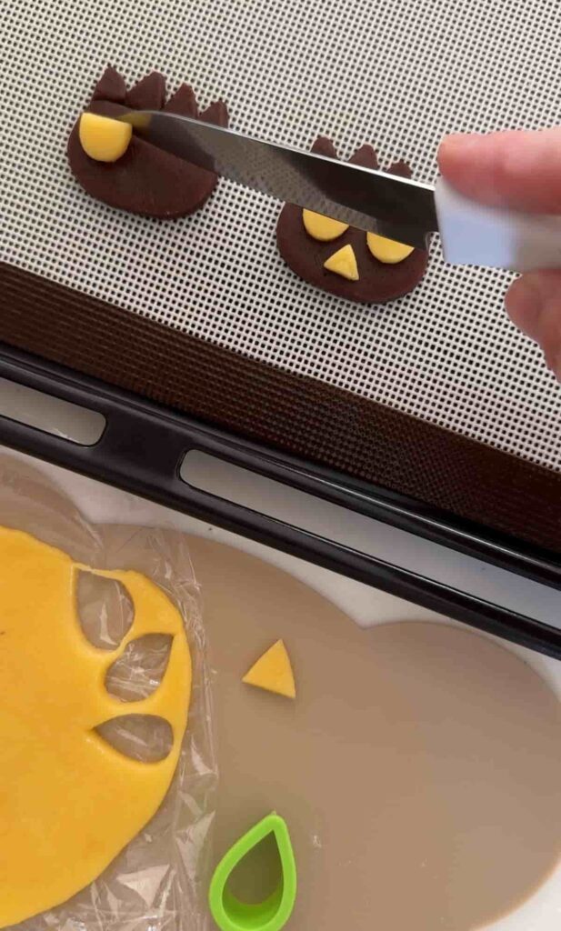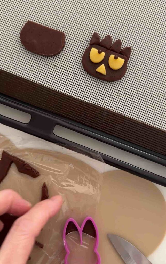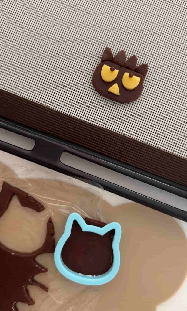 ココア生地をねこ型で抜き、上を切り取って顔。