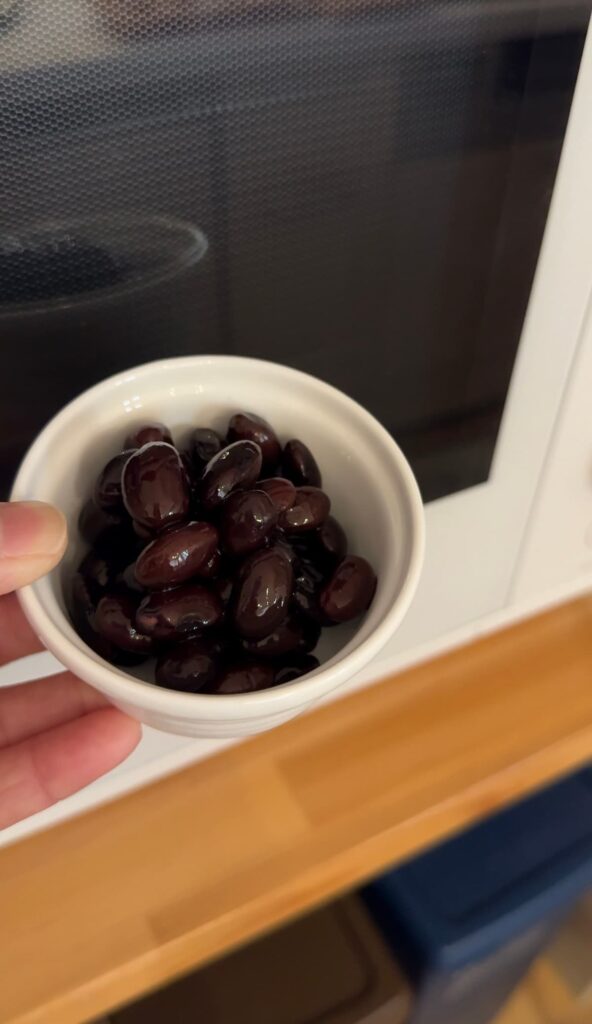黒豆はじめて炊きました。黒豆の袋の裏に書いてあるレシピに沿って。
