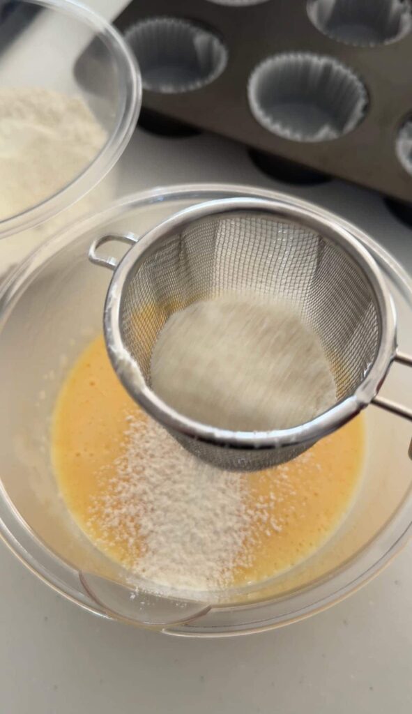 7.Add the mixed “wheat flour & almond powder & baking powder” while siftug,and mix well with a whisk.