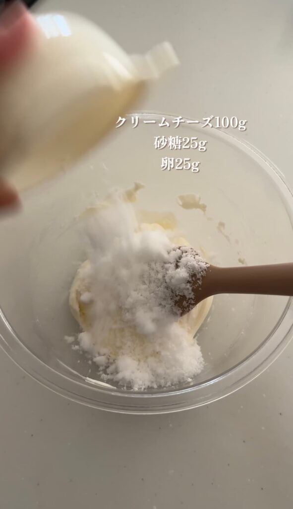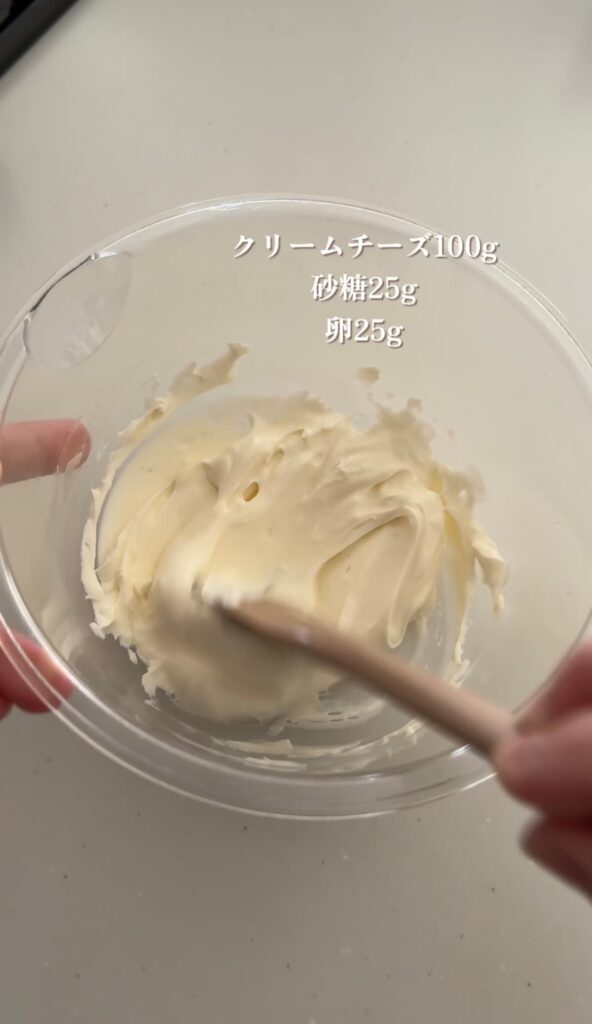 ①常温でやわらかくしたクリームチーズに砂糖を加え、ヘラでよくすり混ぜる。