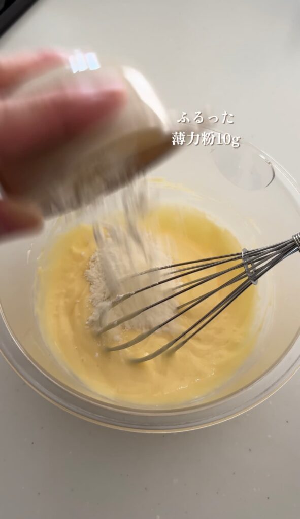 ③ふるっておいた薄力粉を加え、ホイッパーでよく混ぜる。