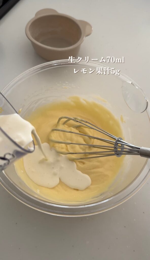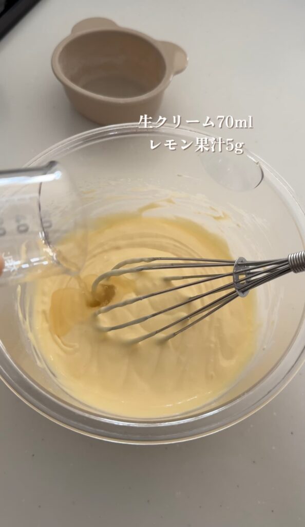 ⑤レモン果汁を加え、ホイッパーで混ぜ合わせる。