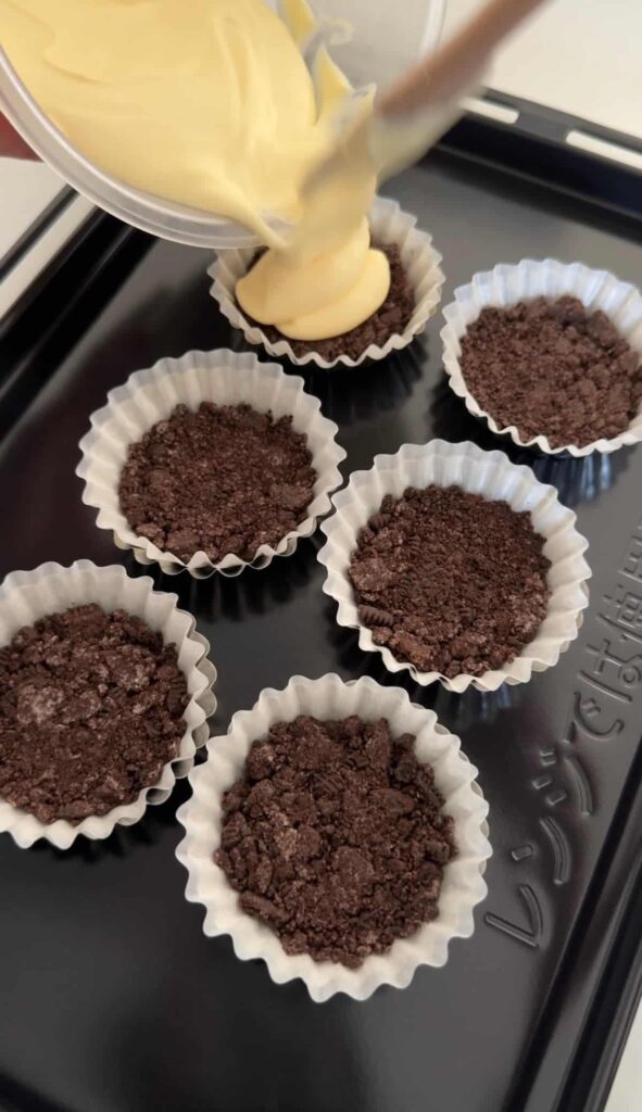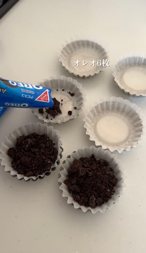 ⑥オレオを細かく砕き、グラシンケースをセットしたマドレーヌ型に敷く。