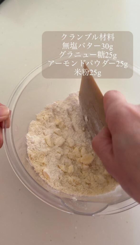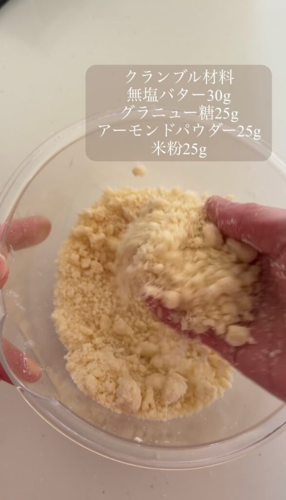 クランブル生地はまとまりにくいので、ある程度バターが細かくなったら手でつかむようにして生地をつなぎます。