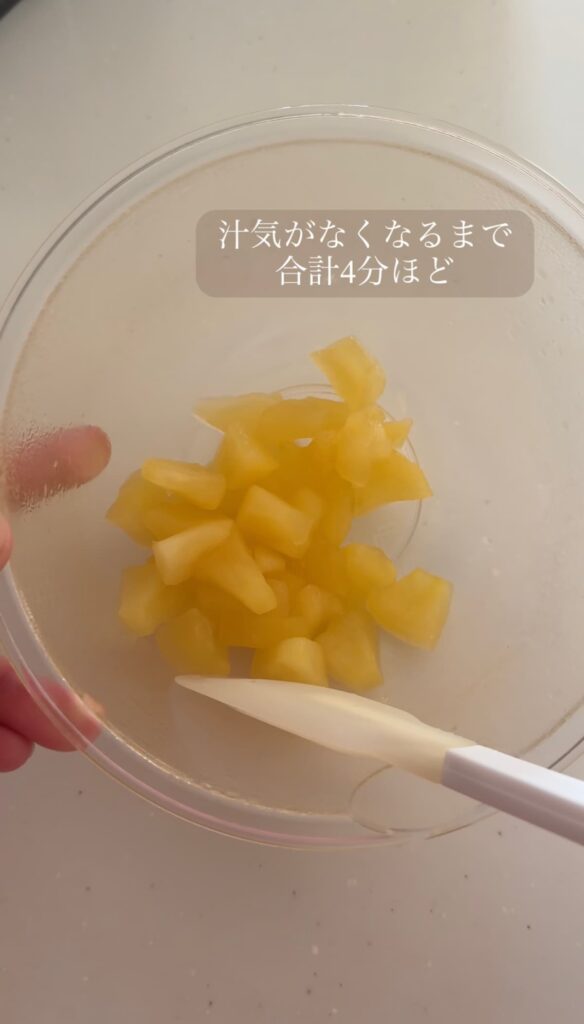 1分加熱&混ぜるを4回ほど繰り返すと汁気がなくなると思います。