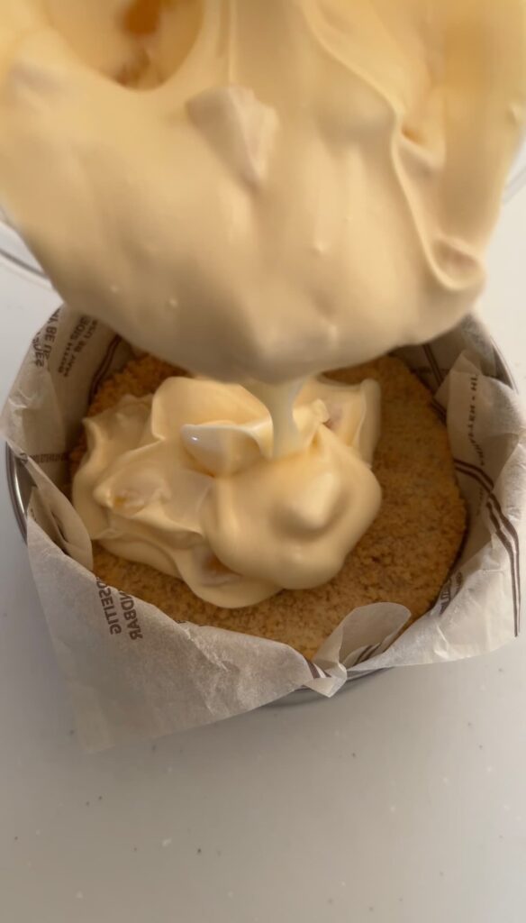 ⑫③のクランブルを敷いた型にチーズケーキ生地を流し込む。