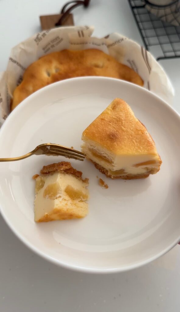 大きめにカットしたりんごの食感とベイクドチーズケーキのねっとり感♡米粉のザクザククランブルが口の中で混ざり合って最高のおいしさになります!