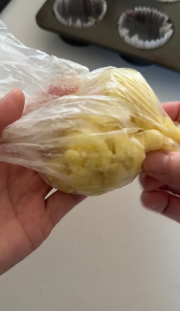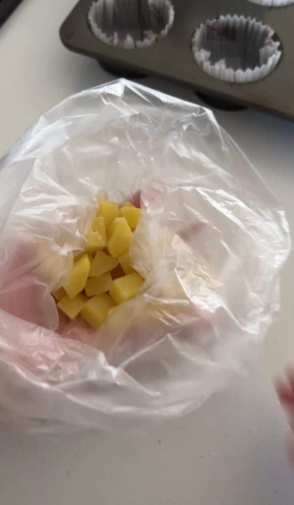 さつまいもはゆでてビニール袋でつぶすだけ!さつまいもをゴロゴロ感じられるマフィンです。