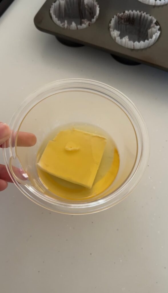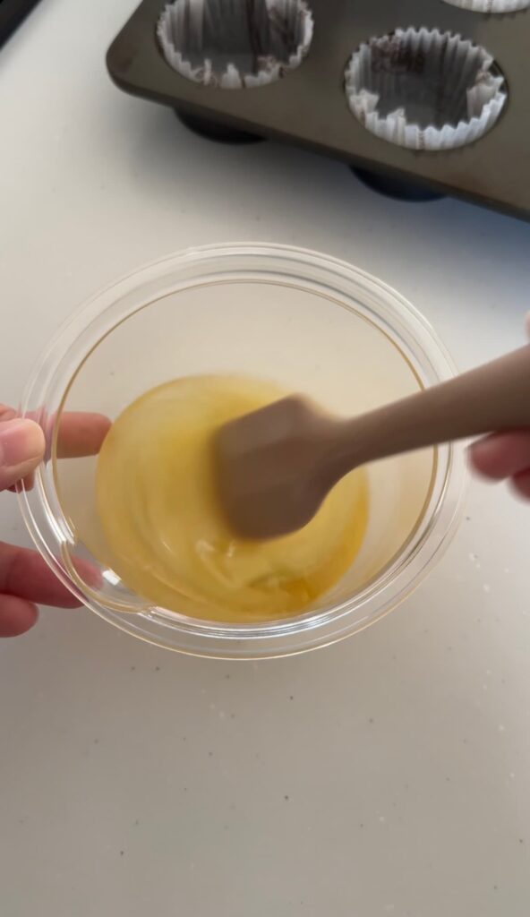 ①植物油と無塩バターをボウルに入れ、電子レンジ(600W)で10秒ほど加熱し、無塩バターを溶かしておく。溶けないときは追加で数秒加熱する。