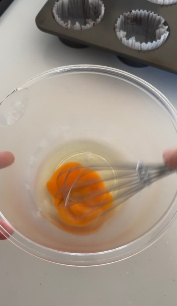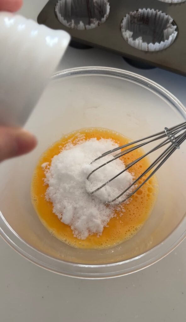 ②①とは別のボウルで常温に出しておいた卵をよく溶いて、上白糖を加えホイッパーでよく混ぜる。