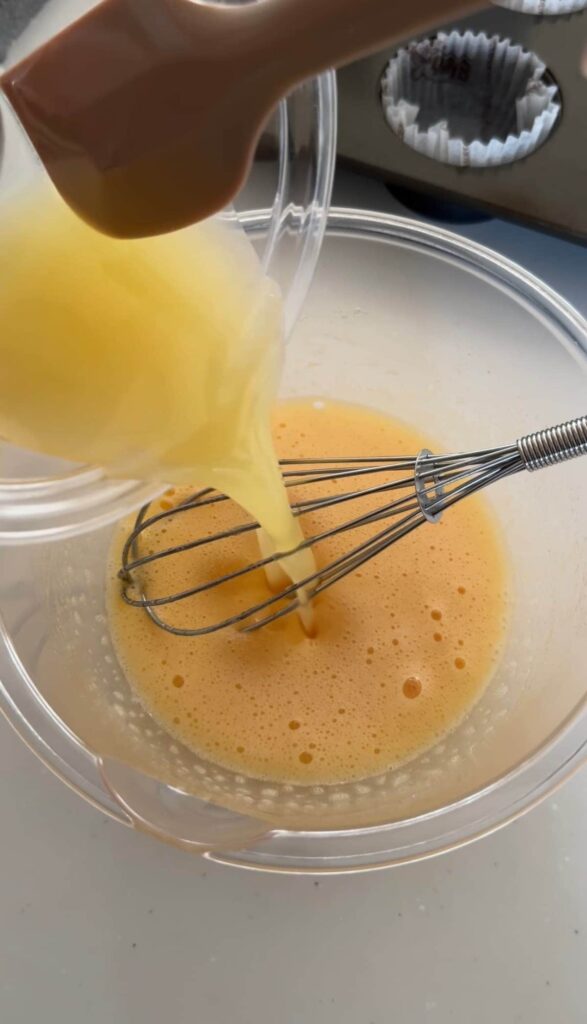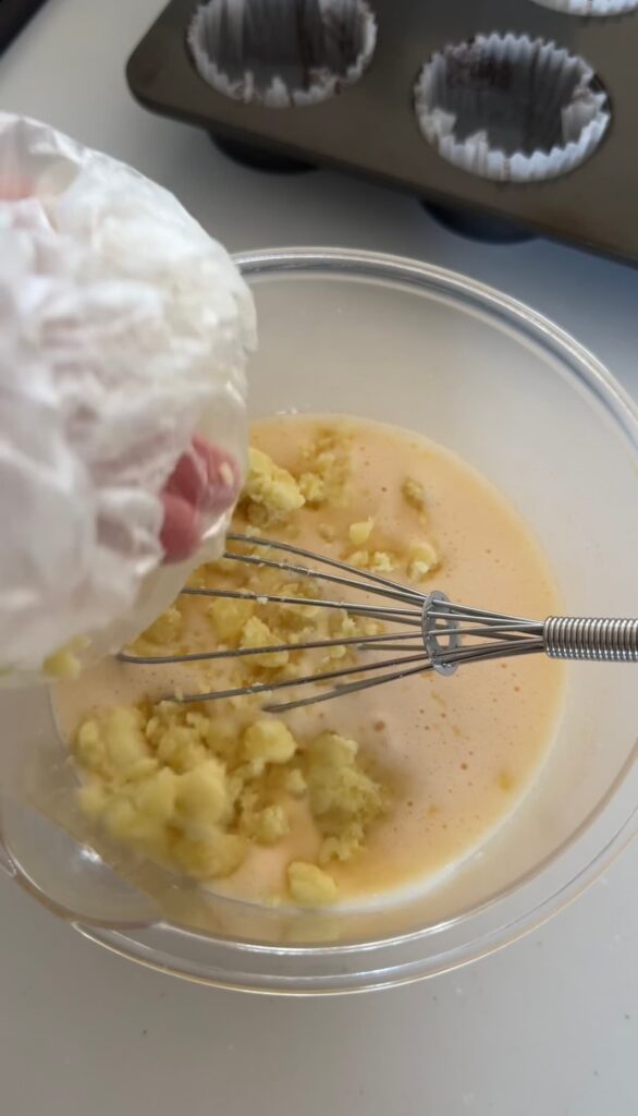 ④①の溶かしておいた無塩バター&植物油を加え、ホイッパーでよく混ぜる。