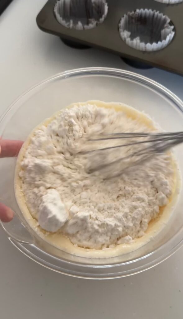 ⑦合わせてふるっておいた薄力粉&ベーキングパウダーを加え、ホイッパーで混ぜる。