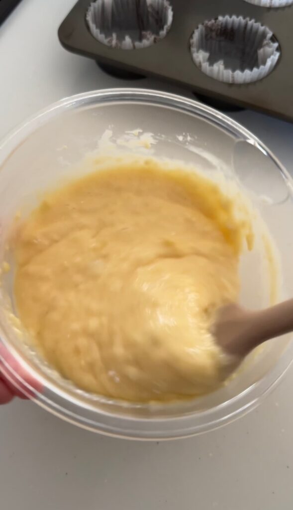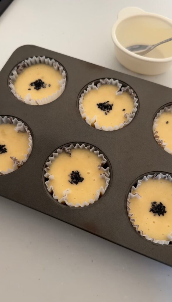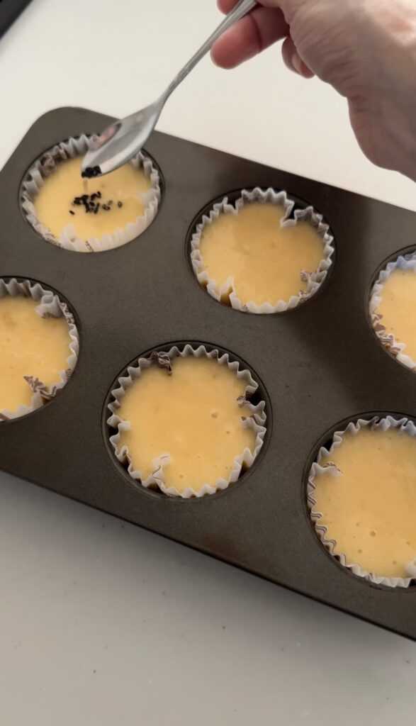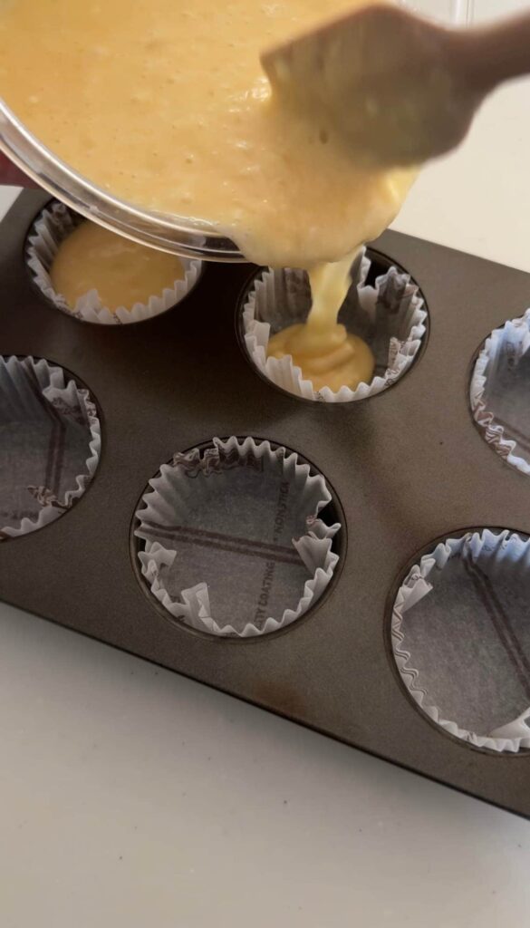 ⑧グラシンケースをセットしたマフィン型に生地を流し込む。